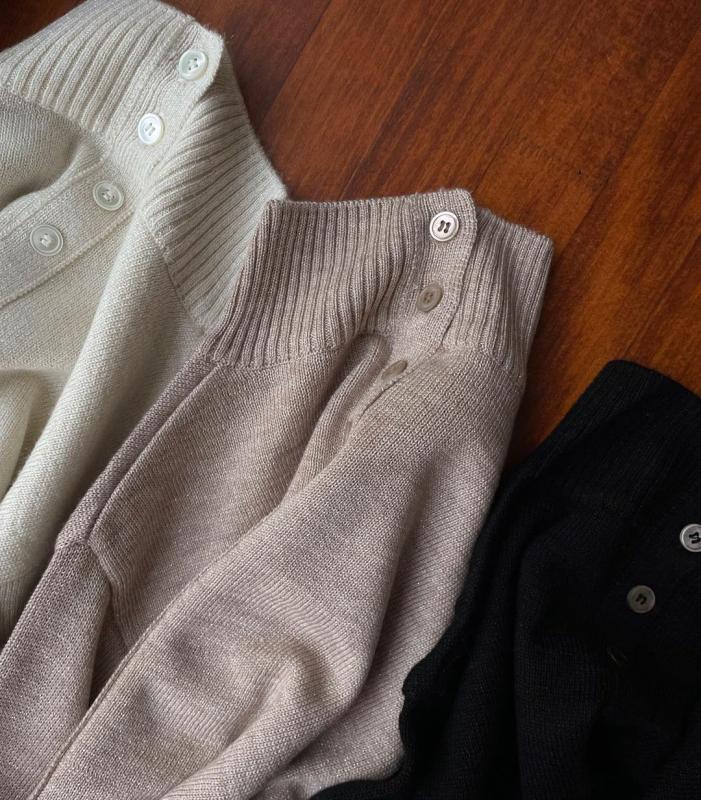 아주 부드러운 타입으로 너무 두꺼운 스타일이 아니라 시즌 구애 안받고 이너로도 단독으로도 코디하기 좋고 무엇보다 메탈사를 은은하게 연사한 독보적인 기술력를 볼 수 있는 하프넥 펄 니트