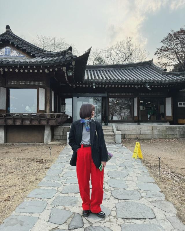ootd 오오티디 dailylook 데일리룩 블레이저 블레이저코디 봄코디 여자봄코디 여자옷코디 옷코디 패션계정 가니 ganni girls redpants 레드팬츠 red 울블레이저 woolblazer 스카프코디 한옥 한옥카페