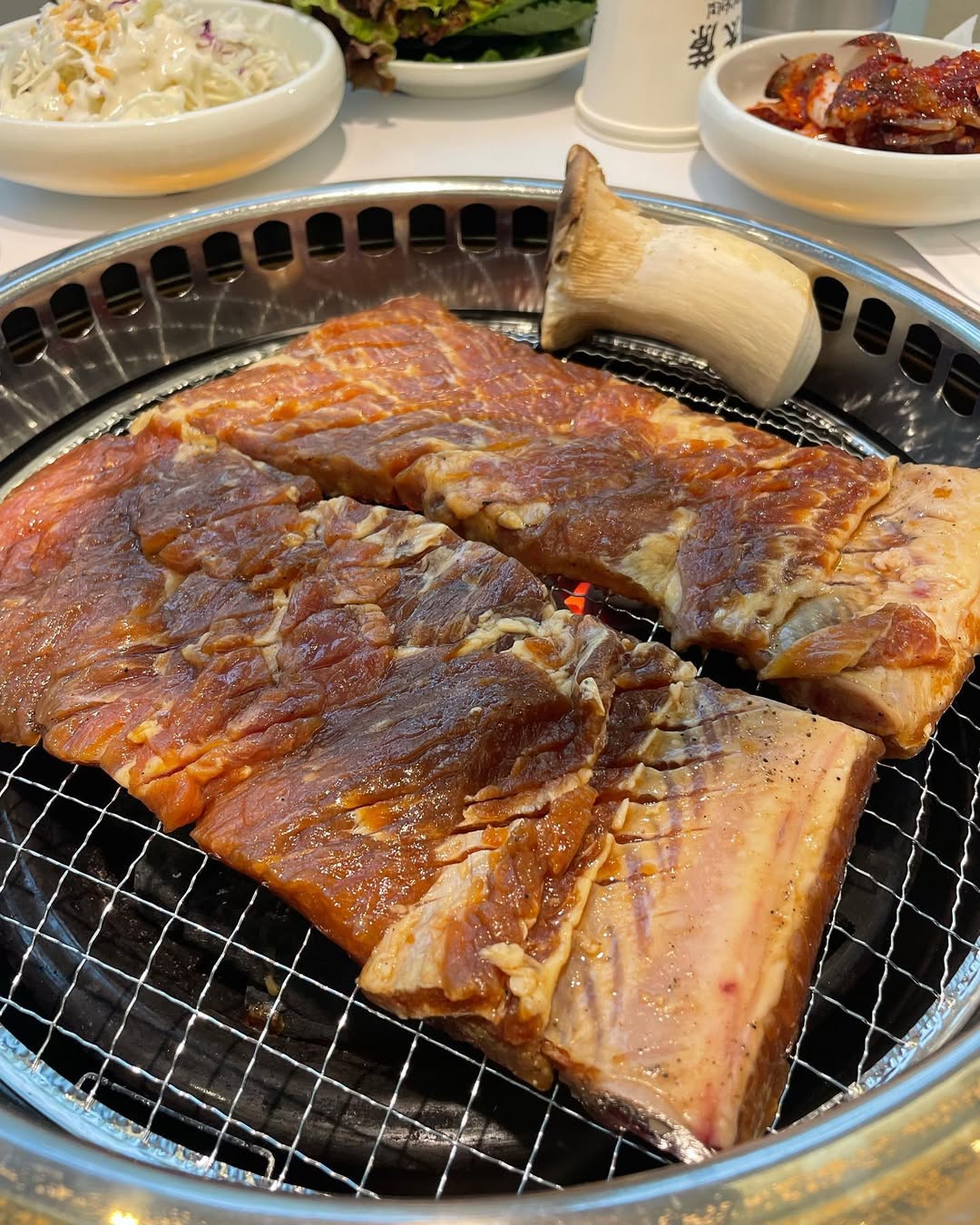이곳의 시그니처 메뉴인 양념 돼지갈비는 정말이지 '인생 갈비'라고 해도 과언이 아닐 정도였어요! ✨ 적당히 달콤하면서도 깊은 양념이 살코기에 촉촉하게 스며들어 있었고, 숯불 향이 더해져 입안에서 살살 녹는 듯한 환상적인 맛이었답니다. 🤤 무엇보다 좋았던 점은 직원분들께서 처음부터 끝까지 모든 고기를 정성껏 직접 구워주신다는 점이었어요. 🔥