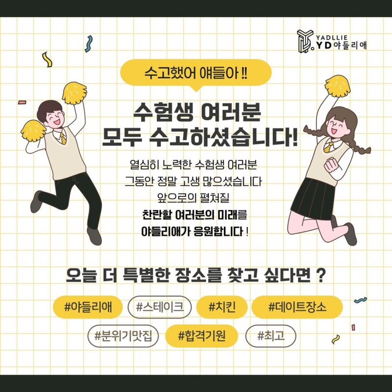누구보다 긴장되는 마음으로 열심히 준비했을 수험생 여러분들을 야들리애는 진심으로 응원합니다 !!