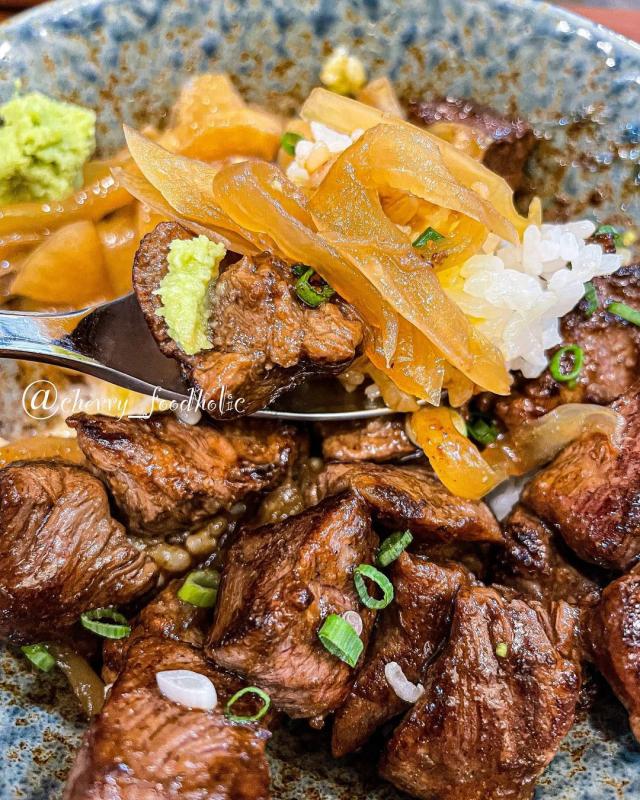 소고기 부태살이 큰 큐브형태로 들어가 있어요 🥰 노른자를 탁‼️ 터트려 요리저리 비비면 진짜 존맛탱🥲 역시 밥과 고기는 부정할 수 없는 조합인가💓 소스가 특히 맛있는데 달지도않고 짜지도 않은 고유의 맛으로 고기의 식감과 풍미를 살려줘요😁 양파랑 같이 얹어 먹으면 양파의 아삭아삭한 식감이 너무 맛있어서😁 조합이 너무너무 좋은것 같아요😍 와사비까지 함께하면 알싸한 맛이 느끼한 맛을 잡아줘서