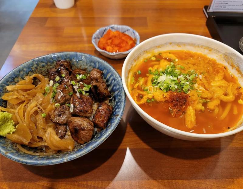 특제 소스로 간이 된 스테이크덮밥은 두툼한 고기에 육즙이 팡팡... 김치유부우동은 은근 칼칼 개운하니 맛나다 맛나~~!! 😋😋😋
