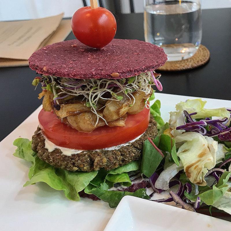 달콤한 대추야자소스를 곁들인 양파절임과 짭짤한 캐슈치즈를 비건패티에 올려 밀가루 대신 비트와 견과류로 빗어낸 빵과 함께 내어주시는 정성가득한 캐러멜치즈버거🍔