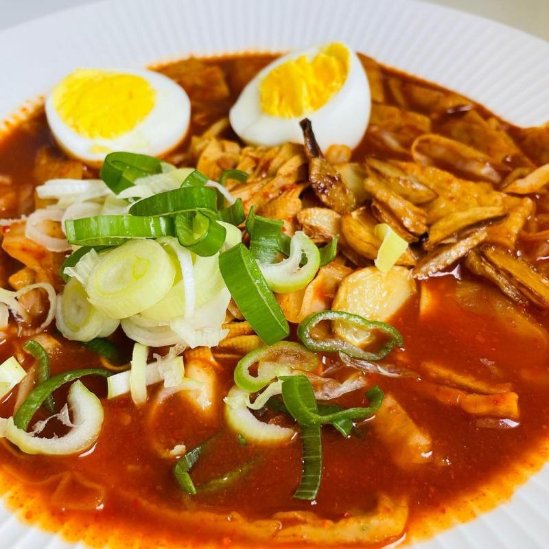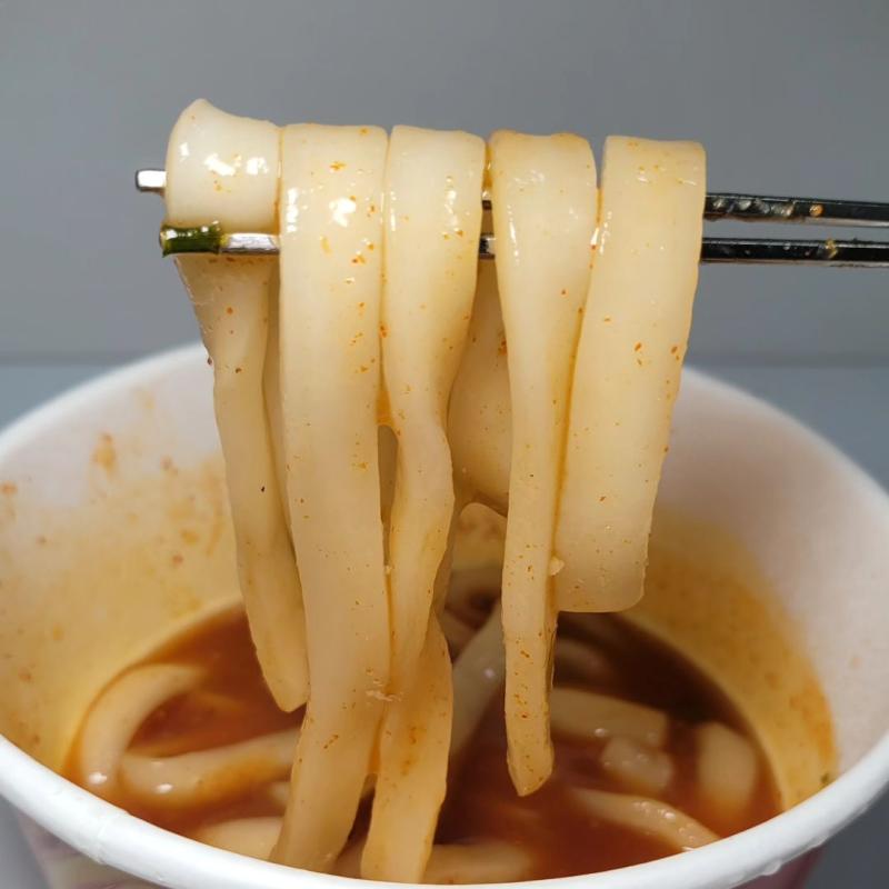 우선 분말 스프를 뜯으면 가루와 함께 초록 파 조각 같은 것도 보여요. 이 가루에는 매콤한 냄새도 나지만 치즈스러운 부드러운 냄새도 나서 기대감을 올려주었습니다. 먹어보니 더 대박이었어요. 국물은 살짝 꾸덕한데 엄청 매콤 달달해요. 녹진한 느낌도 있어요. 게다가 누들떡이어서 면 비주얼도 약간 칼국수 같은데, 먹다 보면 진짜 칼국수 같은 느낌도 나요. 녹진하고 매콤한 국물과 널찍한 면이 많나 칼국수 한그릇을 먹는 듯 엄청 든든합니다. 면에 국물도 진짜 잘 배었고, 면도 쫀득쫀득하니 맛있어요. 국물도 적절히 맵달해서 조합이 최고입니다.